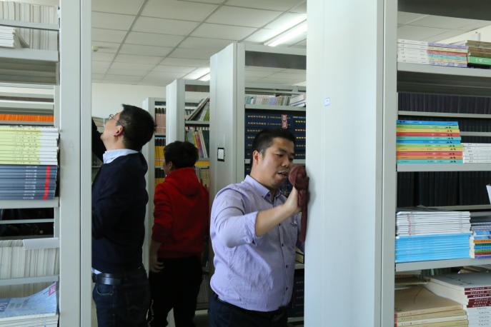 经过一个多小时的辛勤劳动,学院档案室、图书资料中心的书架,书柜,地面等 “焕然一新”。