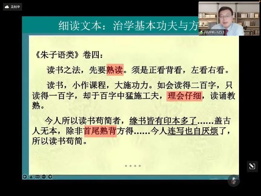 陈老师进一步举王维的《山中与裴秀才迪书》为例进行解读,并以朱熹的《朱子语类》卷四中提到的“读书之法”为文本细读的标准。