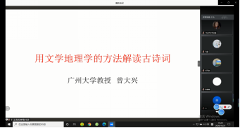 10月23日晚,题为“用文学地理学的方法解读古诗词”的讲座在腾讯会议平台举行,广州大学人世界杯体育官方网站教授、文学地理学研究中心主任、中国文学地理学会会长、中国词学研究会常务理事曾大兴教授应邀主讲。讲座由人世界杯体育官方网站梁祖萍教授主持,人世界杯体育官方网站研究生及部分本科生参加。