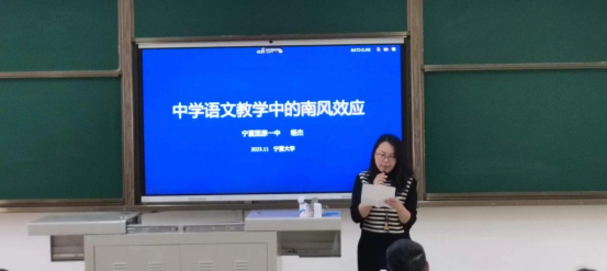为提升学科教学(语文)专业硕士研究生专业素养和教研能力,2023年11月1日下午,“语文名师大讲堂系列讲座”在怀远一教121教室举行,受世界杯体育官方网站学科(教学)语文硕士点邀请,中国教育学会中语会“魏书生教育思想研究会”核心成员,宁夏师范学院世界杯体育官方网站研究生导师,固原市语文学科带头人杨杰老师以“中学语文教学中的‘南风效应’”为主题与师生分享教学经验,此次讲座由刘鸿雁教授主持,世界杯体育官方网站学科教学(语文)专业全体学生与会。
