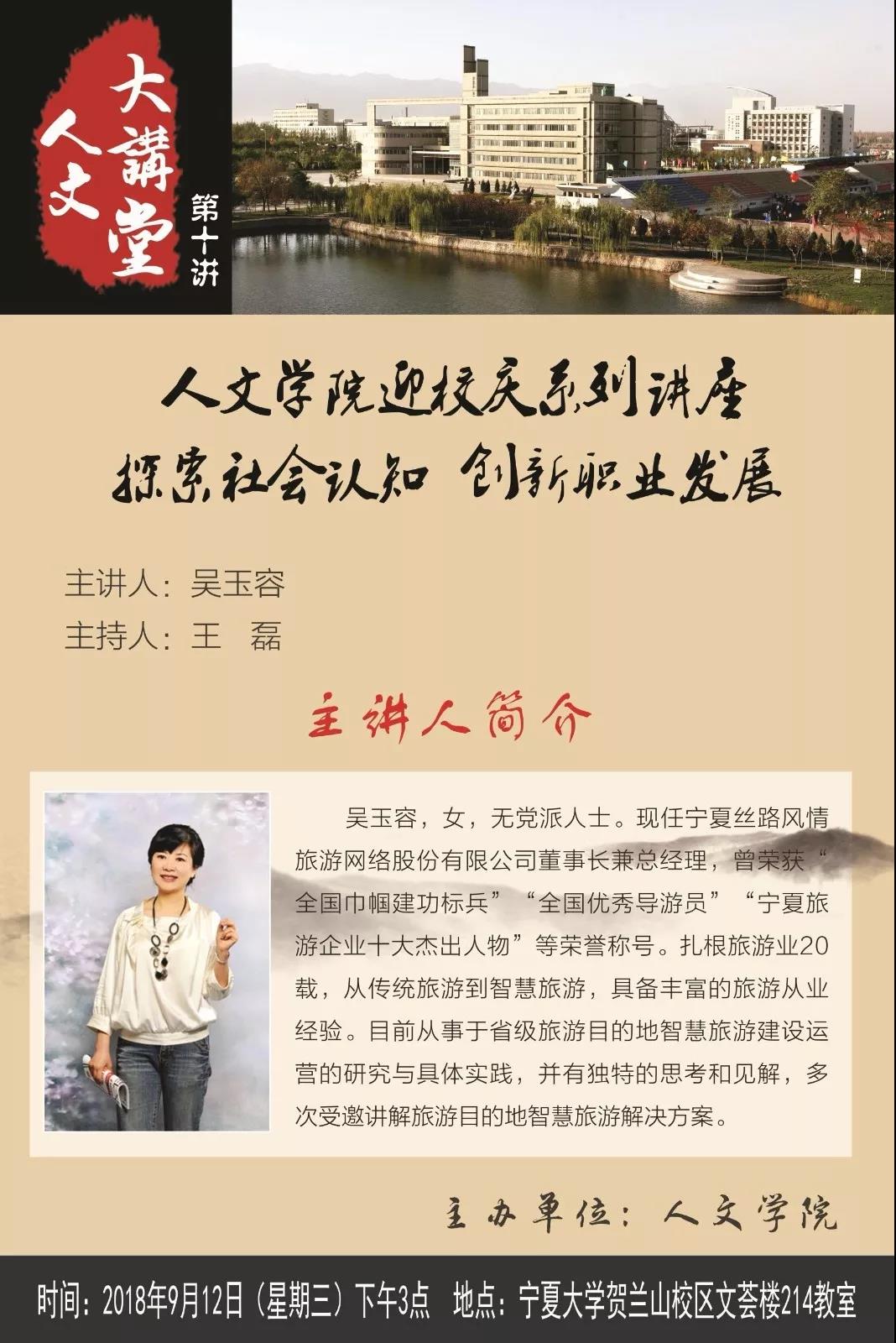 9月12日下午,人世界杯体育官方网站迎校庆系列讲座于世界杯体育官方网站贺兰山校区文荟楼214教室顺利开讲。此次讲座由宁夏丝路风情旅游网络股份有限公司董事长兼总经理吴玉容主讲。