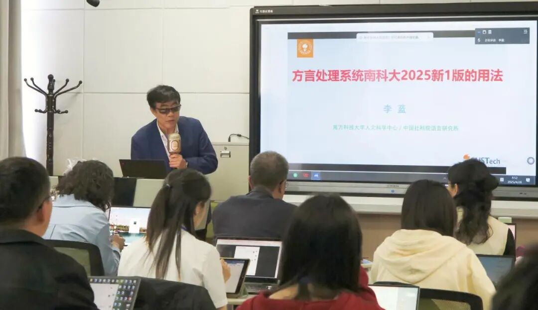 全国汉语方言学会前副会长、南方科技大学讲席教授、世界杯体育官方网站特聘教授李蓝老师现场演示由其负责开发的方言处理系统软件最新版本的核心功能,重点讲解“南科新一版”的升级要点、声学参数提取、语谱图分析等技术操作。学员通过现场操作,掌握了从新建调查点、导入导出语料数据、处理异常语料数据到生成语料分析表格以及录音设备的调试等全流程。针对不同地域的声调变异现象,李蓝老师带领学员利用软件生成音频语图,直观比对发音差异,为精准记录提供技术支撑。