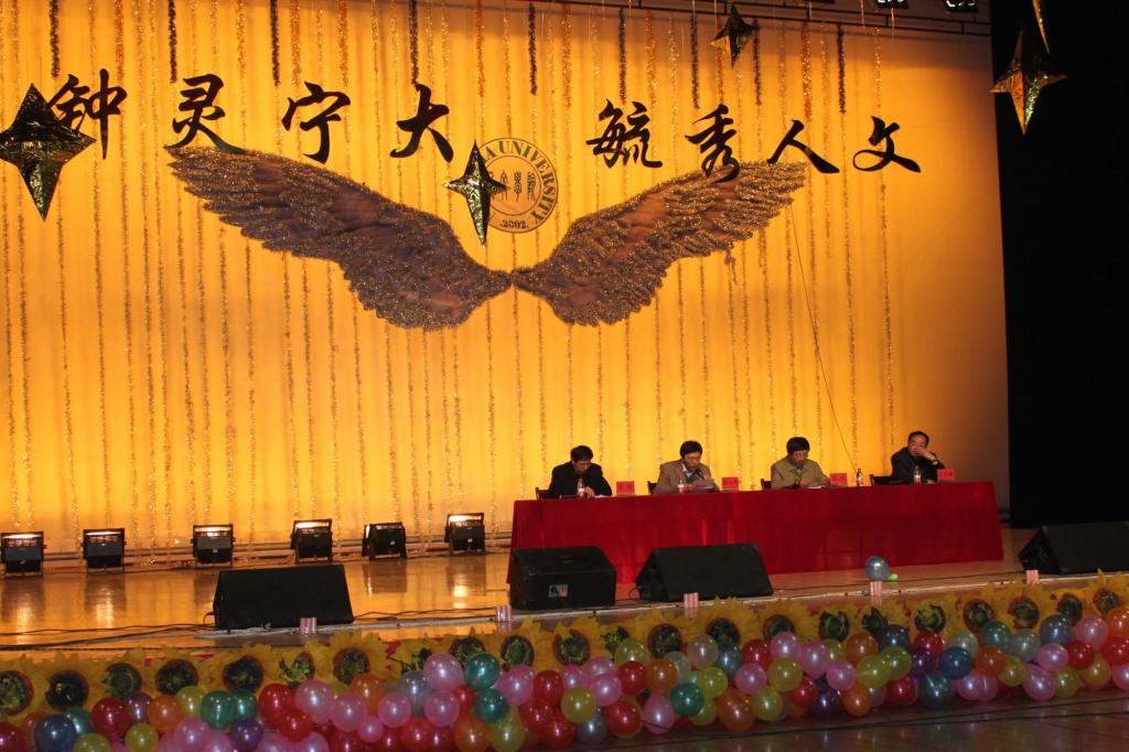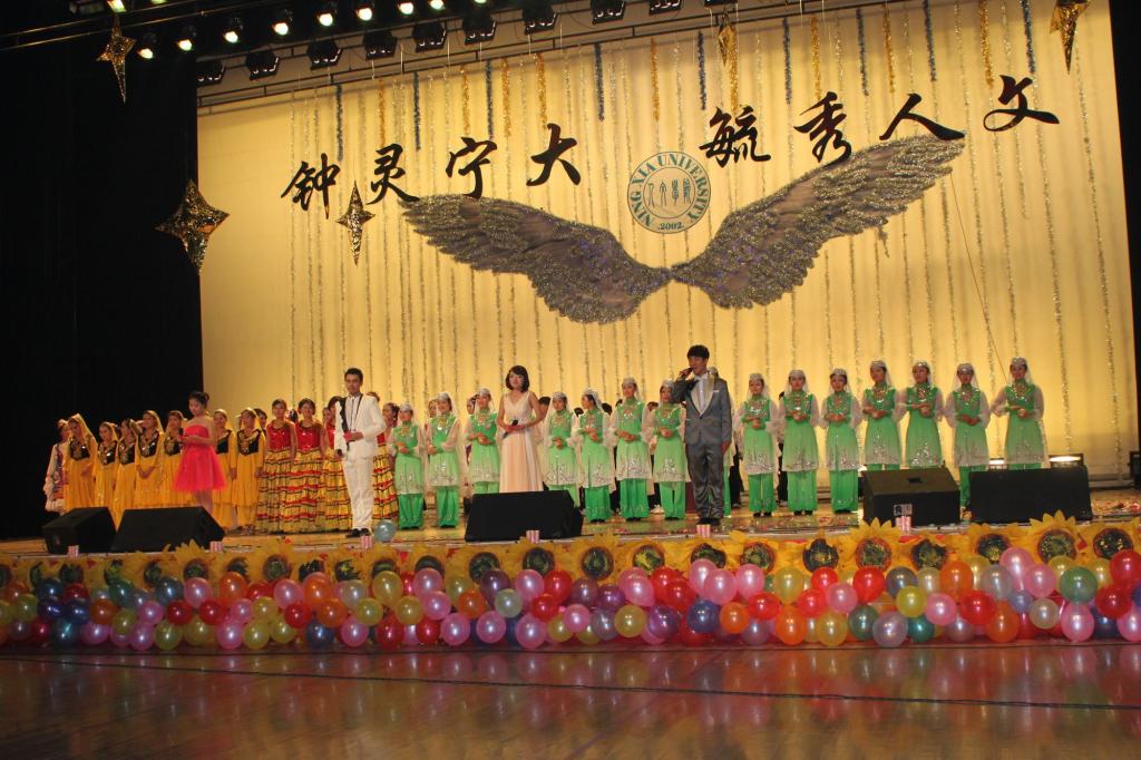 表彰大会结束后,音乐渐起,灯光变幻。在节奏明丽,舞步轻快的开场舞中,让大家期待已久的文艺演出正式拉开序幕。伴随着金色的灯光和优美的旋律,四位主持人一一亮相,他们带领我们一同唱响了“钟灵宁大、毓秀人文”晚会主题。本次晚会分为《相约人文》《激扬青春》《岁月如歌》三个乐章,每一乐章都有精彩的内容呈现给在场的观众。无论是风情各异的民族舞蹈,还是动感活泼的啦啦操;无论是欢快深情的小合唱,还是激情昂扬的诗歌朗诵,无一不引来现场观众热烈的掌声和欢呼声。美丽的天山姑娘、华丽的时装盛宴,还有如火的西班牙风情,都让人回味无穷。激情的歌曲串烧更使得现场气氛达到高潮,欢呼喝彩声此起彼伏。小品《礼物》给大家讲述了一个关于母爱与感恩的故事。一曲《国家》,让我们深深感到作为当代大学生所肩负的重大责任。