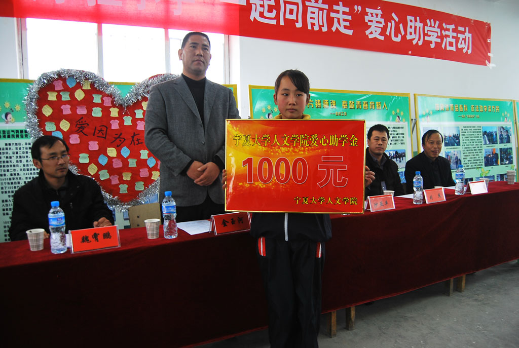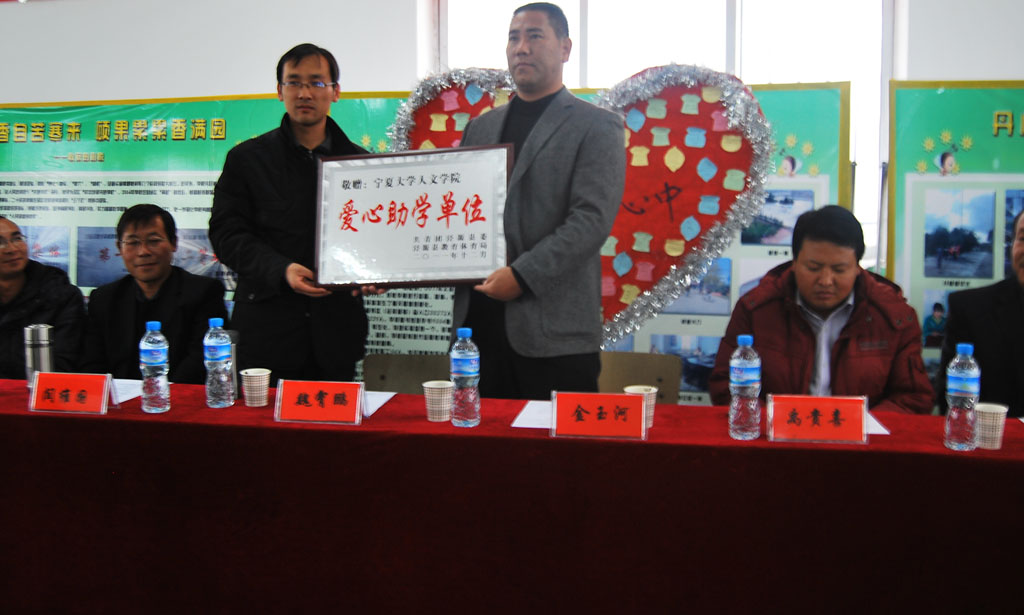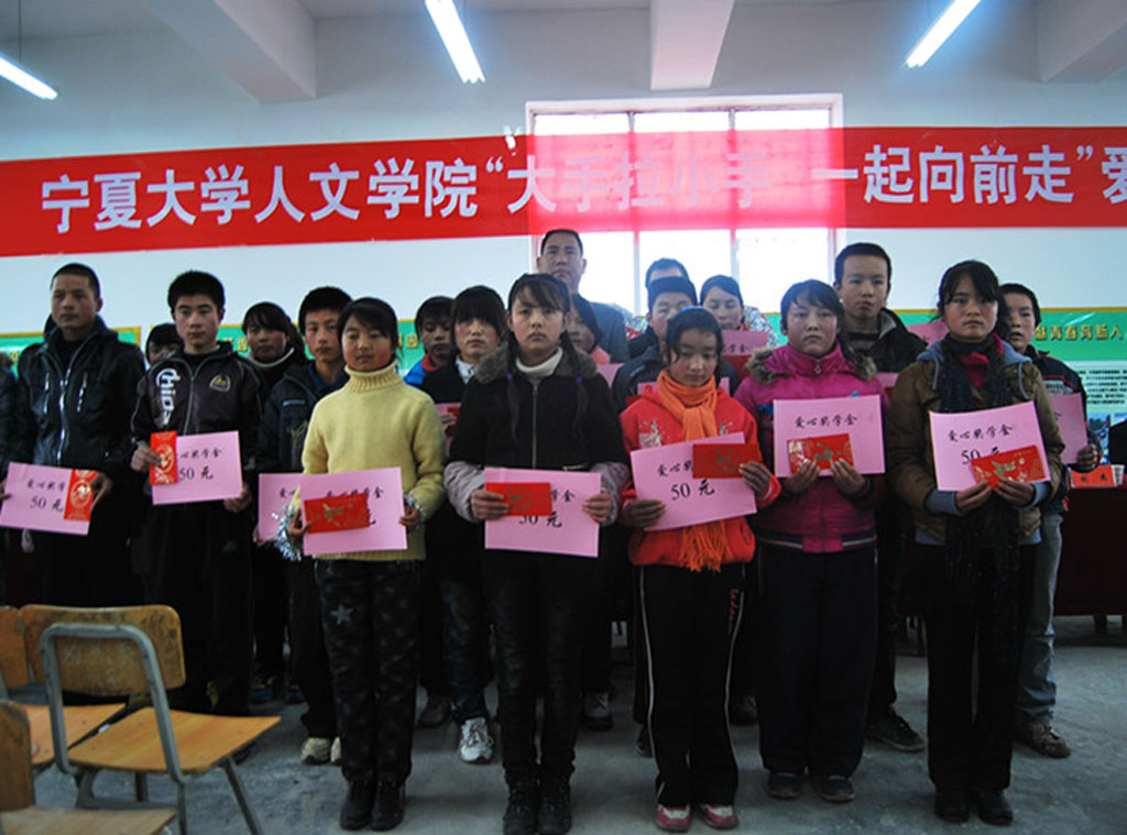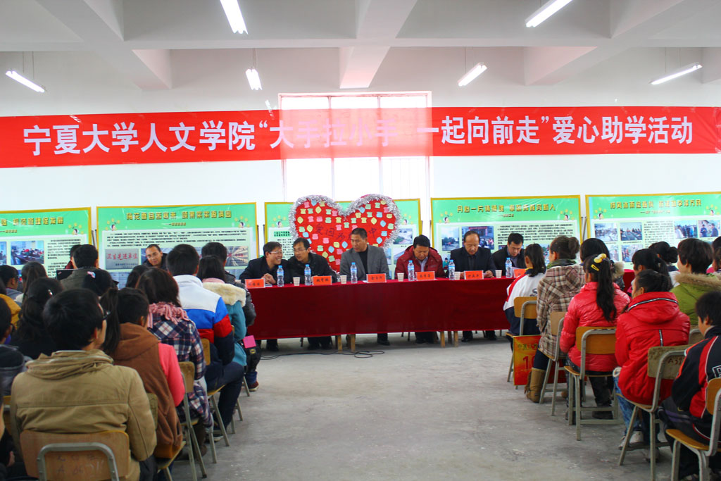 12月3日下午2:00在泾源县二中活动室,在中共泾源县团委领导、泾源县教育局领导、泾源县二中校领导的支持和准备下,人世界杯体育官方网站46名师生与泾源县二中62名同学的参与下,“世界杯体育官方网站人世界杯体育官方网站‘大手拉小手,一起向前走’爱心助学活动”顺利举行。活动中,人世界杯体育官方网站向全校24名品学兼优学生每人发放50元奖学金,向家庭困难学生代表发放爱心助学金1000元,并向各班发放爱心助学物资,主要是体育用品,如篮球、羽毛球、乒乓球等。同时由泾源县团委、泾源县教育局、为世界杯体育官方网站人世界杯体育官方网站授予“爱心助学单位”荣誉称号。