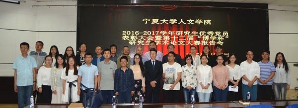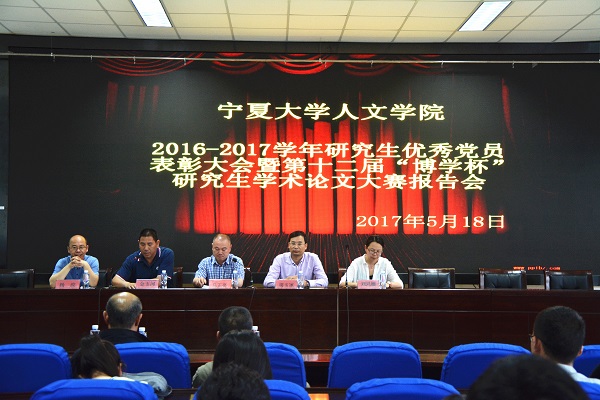 5月18日晚7点,人世界杯体育官方网站2016—2017学年研究生优秀党员表彰大会暨第十二届“博学杯”研究生学术论文大赛报告会在贺兰山校区文科楼一楼东侧报告厅隆重举行。人世界杯体育官方网站党委书记马正亮,院长胡玉冰,副书记金玉河,副院长刘鸿雁、杨浣等领导出席了大会,蔡永贵、霍维洮、钟亚军、杨文笔、丁峰山等老师为获奖学生论文进行了现场点评。人世界杯体育官方网站全体研究生参加了大会。