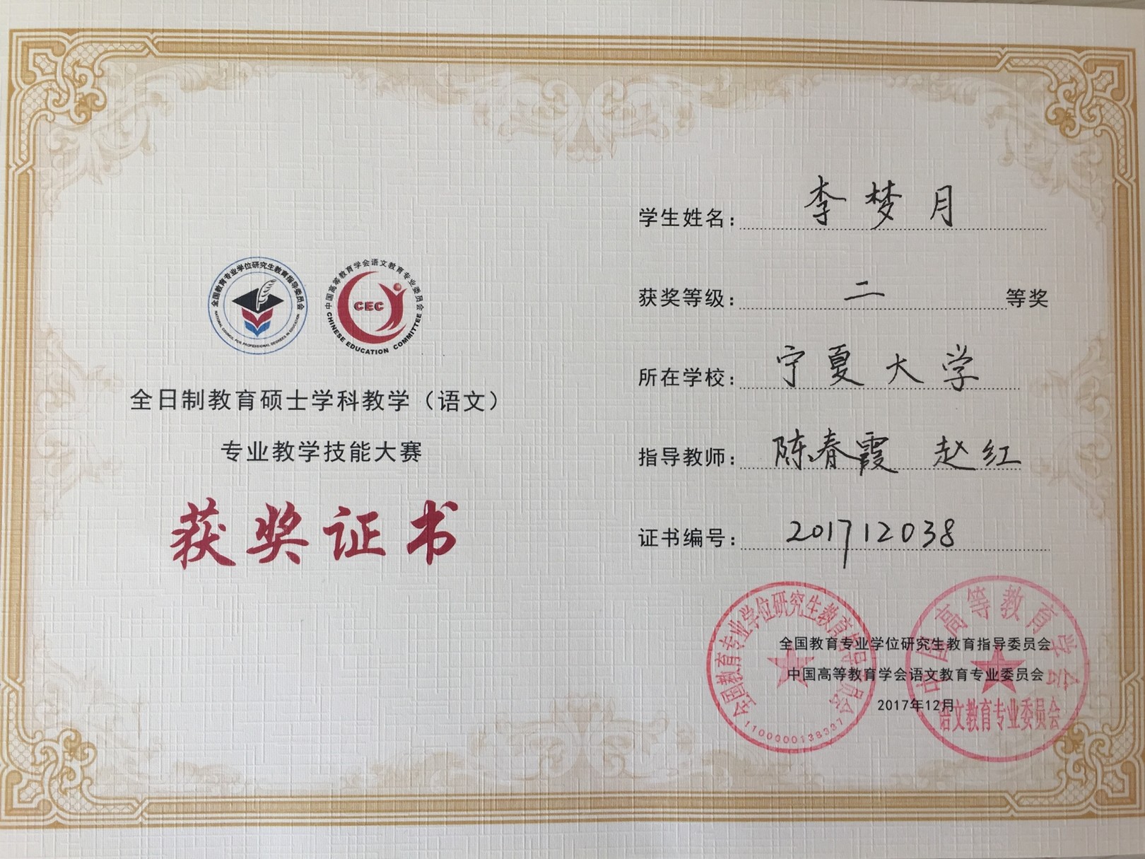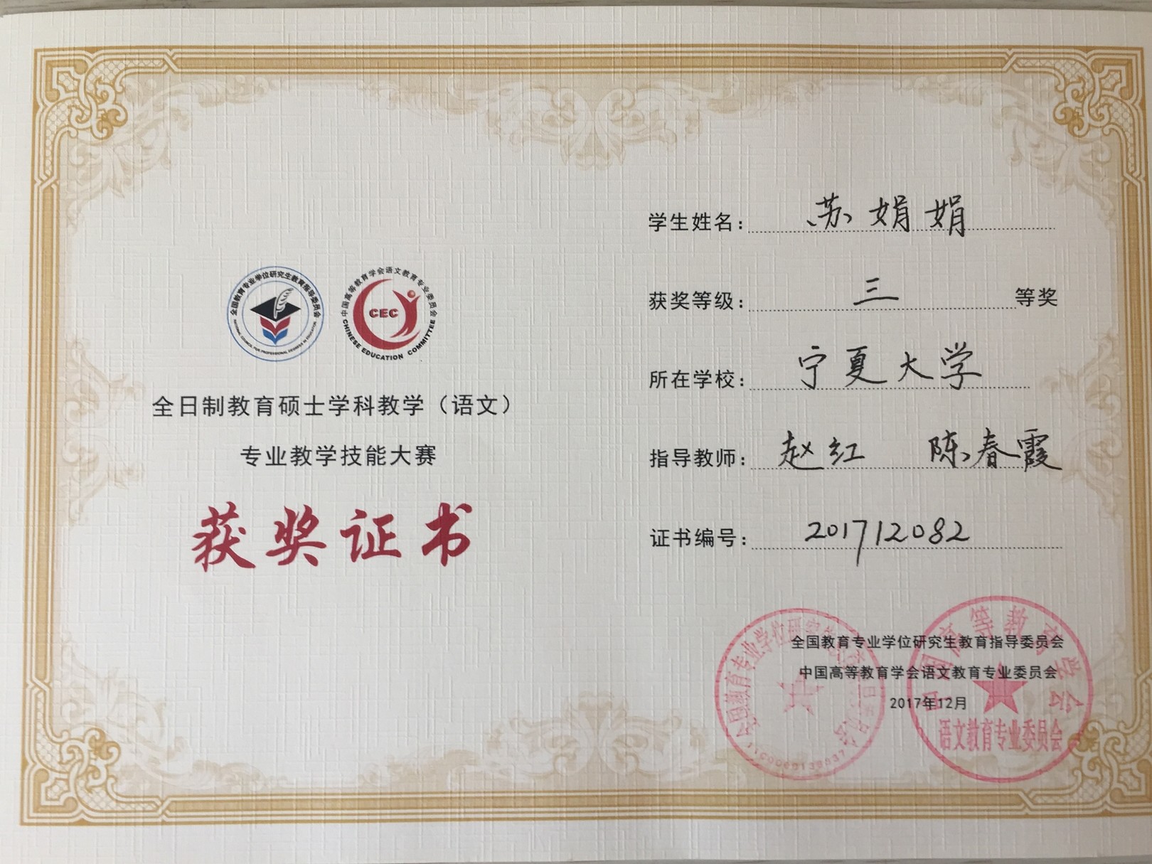 近几年,人世界杯体育官方网站学科教学(语文)硕士点注重培养学生的教学实践能力,指导研究生参加各类教学技能大赛。2017年11月,2017级学科教学(语文)专业的姚心瑞、杨景瑶、安灵童在宁夏高校教育硕士教学技能大赛中分别获得了二等奖两项,三等奖一项的优异成绩。大赛提升了教育硕士的教学实践能力,也为高校教师交流教学经验、展示学子教学风采提供了平台。