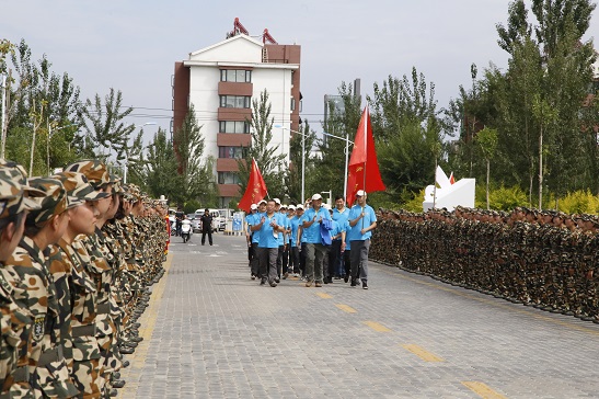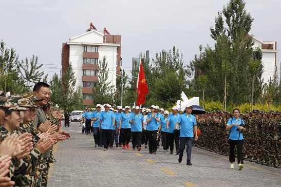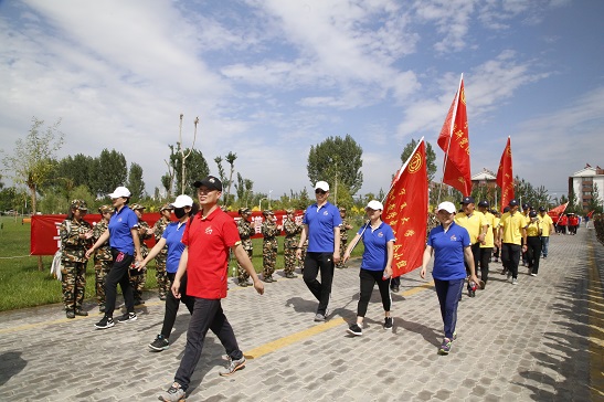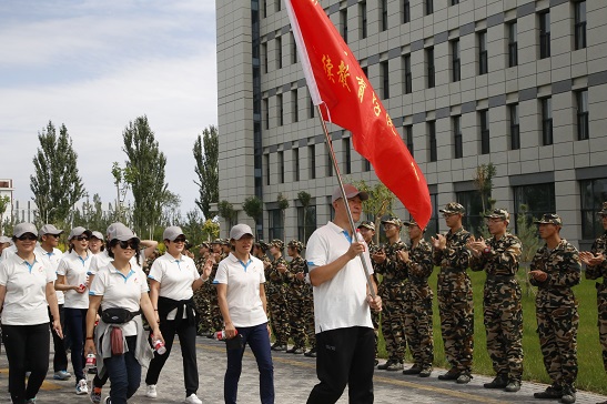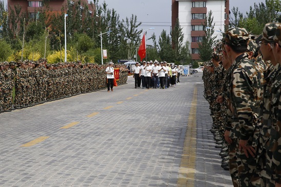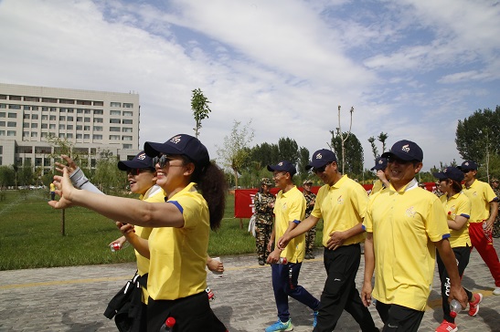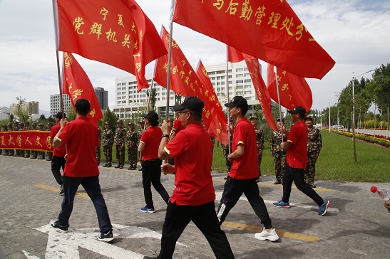 活动伊始,两千教职工身着整齐鲜艳的上衣,齐聚怀远校区足球场,接下来,便是慰问各军训团的活动,整场活动洋溢着紧张而青春的氛围。当时,正值正午两点,烈日当空,骄阳似火。贺兰山校区东门东西向的大路上,两排笔直的“青松”屹立,那正是人世界杯体育官方网站军训团精神饱满,气势昂扬的学生,他们正等待着老师们的到来。十分钟后,教职工们排着整齐的队伍,举着飘扬的红色旗帜,从南面先经过教育学院军训团,在步入人世界杯体育官方网站军训团时,听得见“同学们好!”,“老师好!”,“同学们辛苦了!”,“不辛苦!”看得见的却只有是他们纹丝不动的身影。老师们亲切地问候、同学们也热情地回答,掌声夹杂着笑声此起彼伏,响彻整个校园。人文女兵声音清脆响亮,男兵声音雄浑有力,一声声“钟灵宁大,毓秀人文”,将人文学子昂扬的军魂、挺拔的意志,飒爽英姿淋漓尽致地展现出来。那长长的健步走队伍像一条彩带穿梭在校园,和新生军绿色的迷彩服交相辉映,构成了世界杯体育官方网站一道独一无二的壮丽风景线。在历经近半个小时的慰问之后,人文军训团以嘹亮的迎接口号、饱满的热情迎接了最后一波老师,稍作休整之后又投入到正常的军训作业。