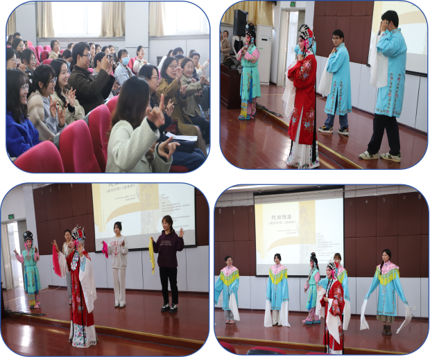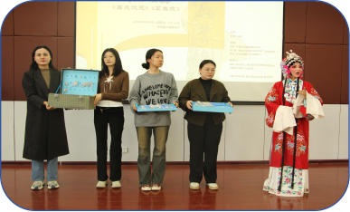 第三部分是戏曲体验。随机邀请8位同学上台进行服饰、道具体验,台下观众也在两位表演老师的指导下模仿兰花掌和兰花指的几种用法,体会演员手势所表达的舞台语言,让在场的观众领会到中国古典戏曲在其漫长的发展过程中存在的传统与艺术精髓,认识到戏曲作为中华传统文化的重要组成部分和艺术的瑰宝,在传承文化、增强文化自信有其自身的独特性。