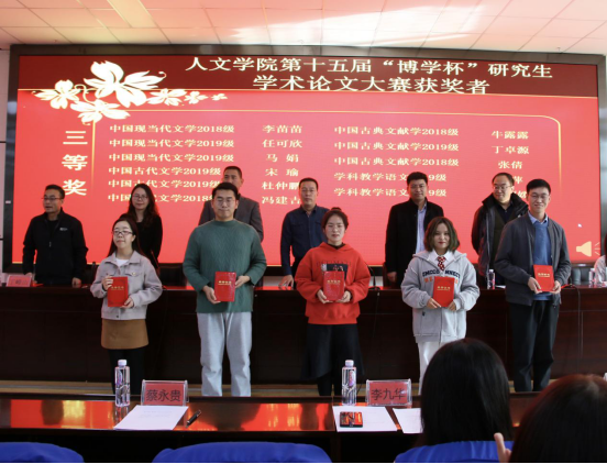 刘鸿雁就本届“博学杯”论文大赛的评审环节及整体情况等进行说明,李胜刚书记宣读第十五届“博学杯”获奖者名单。参会领导为获奖学生颁发荣誉证书。