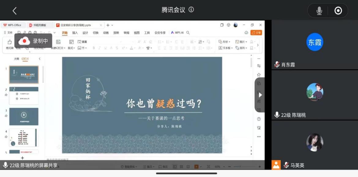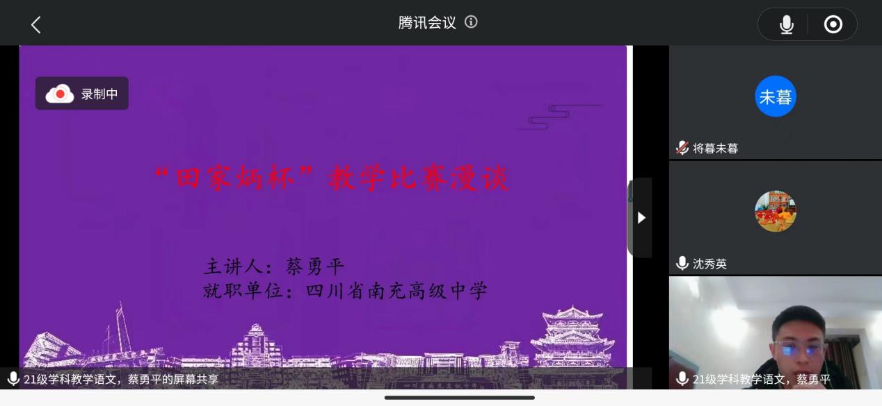 2024年2月22日下午,世界杯体育官方网站在腾讯会议平台顺利举行了第二期“田家炳杯”教学技能大赛参赛经验分享会。分享会旨在通过“田家炳杯”教学技能大赛参赛经验的分享,提升学生的专业技能水平,为本年度教学技能大赛做好充分准备。会议由沈秀英老师主持,邀请了2021级的蔡勇平和2022级的陈瑞桃同学分享他们的参赛体验和心得。梁艳老师和杨志云老师对两位同学的分享进行了精彩的点评,提供了宝贵的建议和指导。2023级学科教学(语文)全体学生与会。